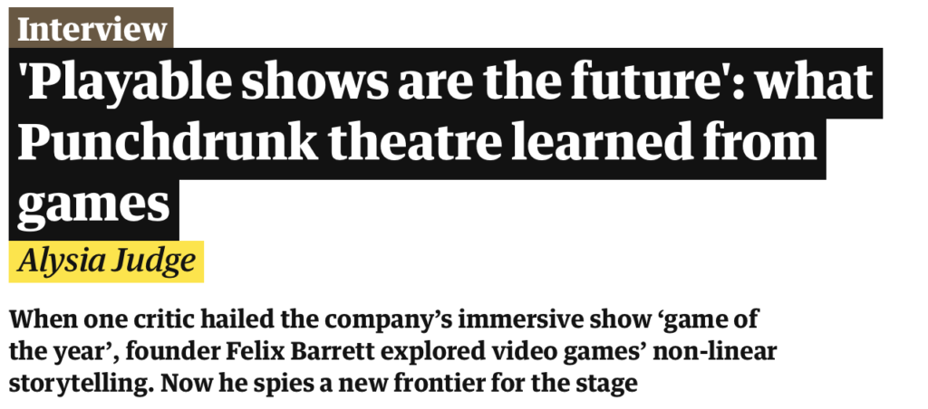 – Alysia Judge, "'Playable shows are the future': what Punchdrunk theatre learned from games"