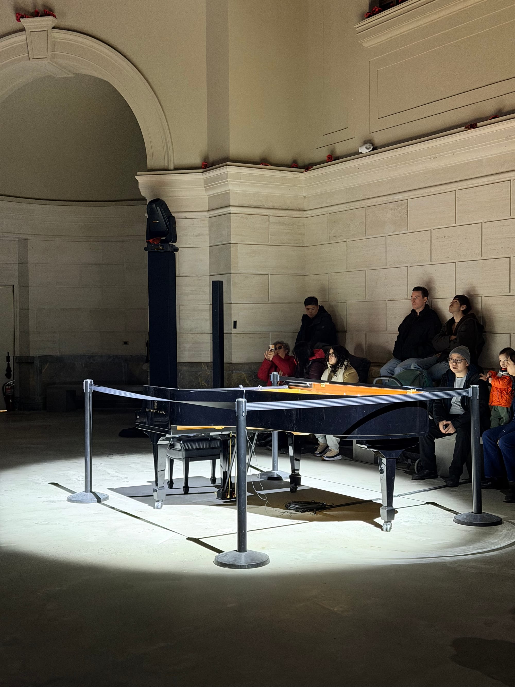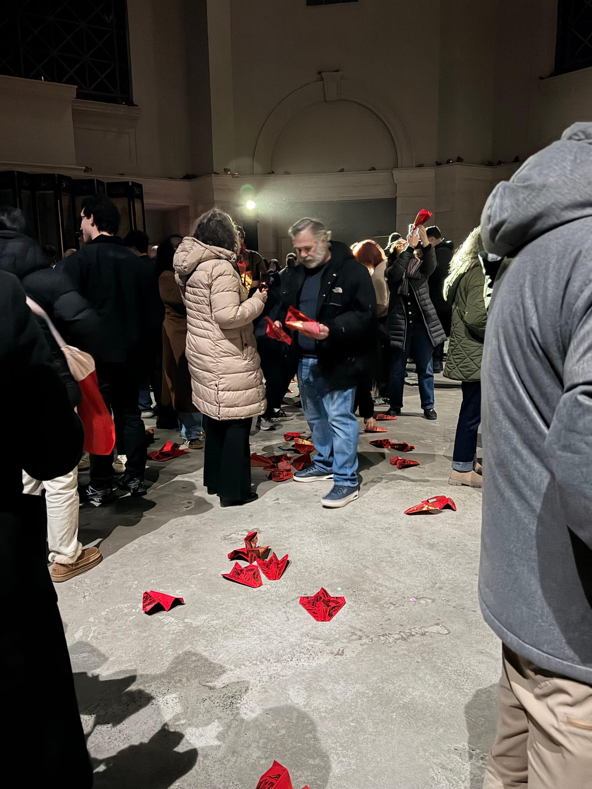 Nope: just 42 minutes of pianos echoing off the old walls of 58 Bowery (now reborn as The Wang Contemporary; this was its opening event), with the last five minutes seeing hundreds of paper planes floating down from the rotunda. Most landed on the floor, some on top of the molding, and at least one in the large metal grids decorating the walls.