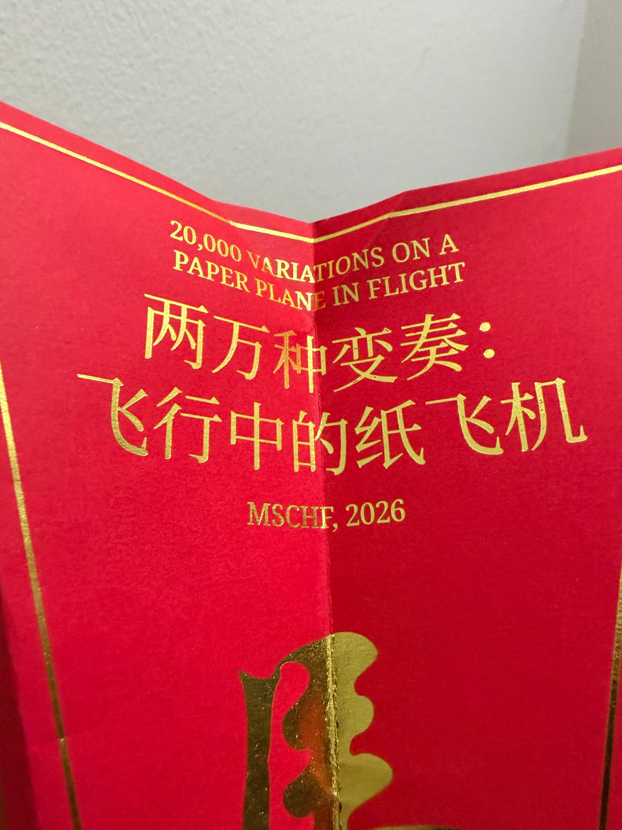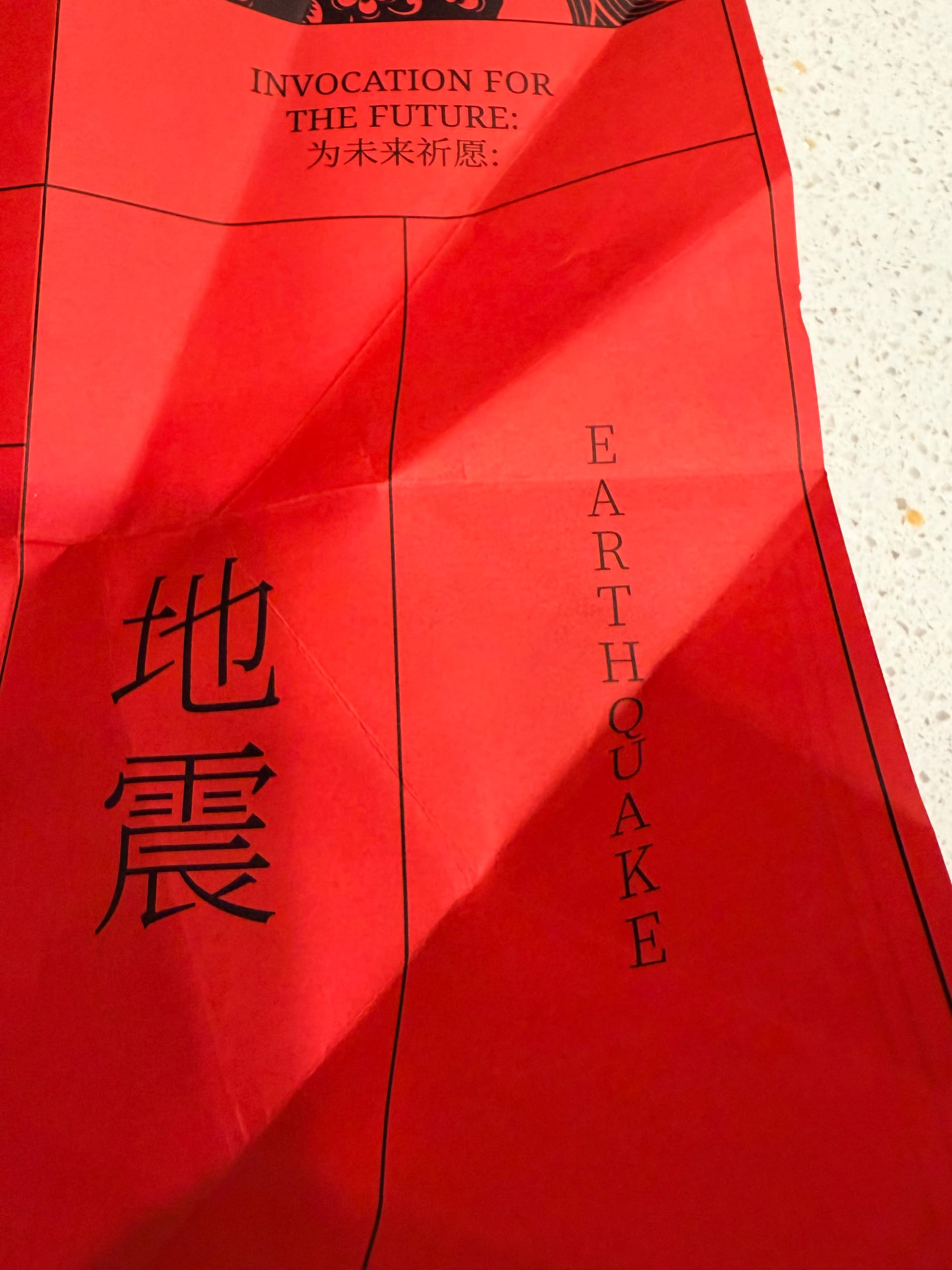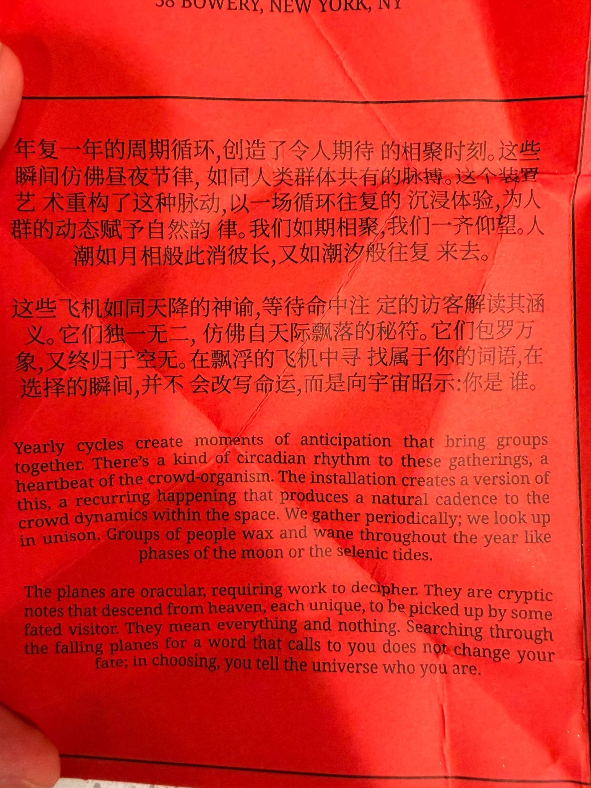 I did grab four of the planes that had landed close to me (some people did stick to one, others were leaving the premises with double-digit stacks). The words, hidden under multiple folds, are labeled as an "INVOCATION FOR THE FUTURE":