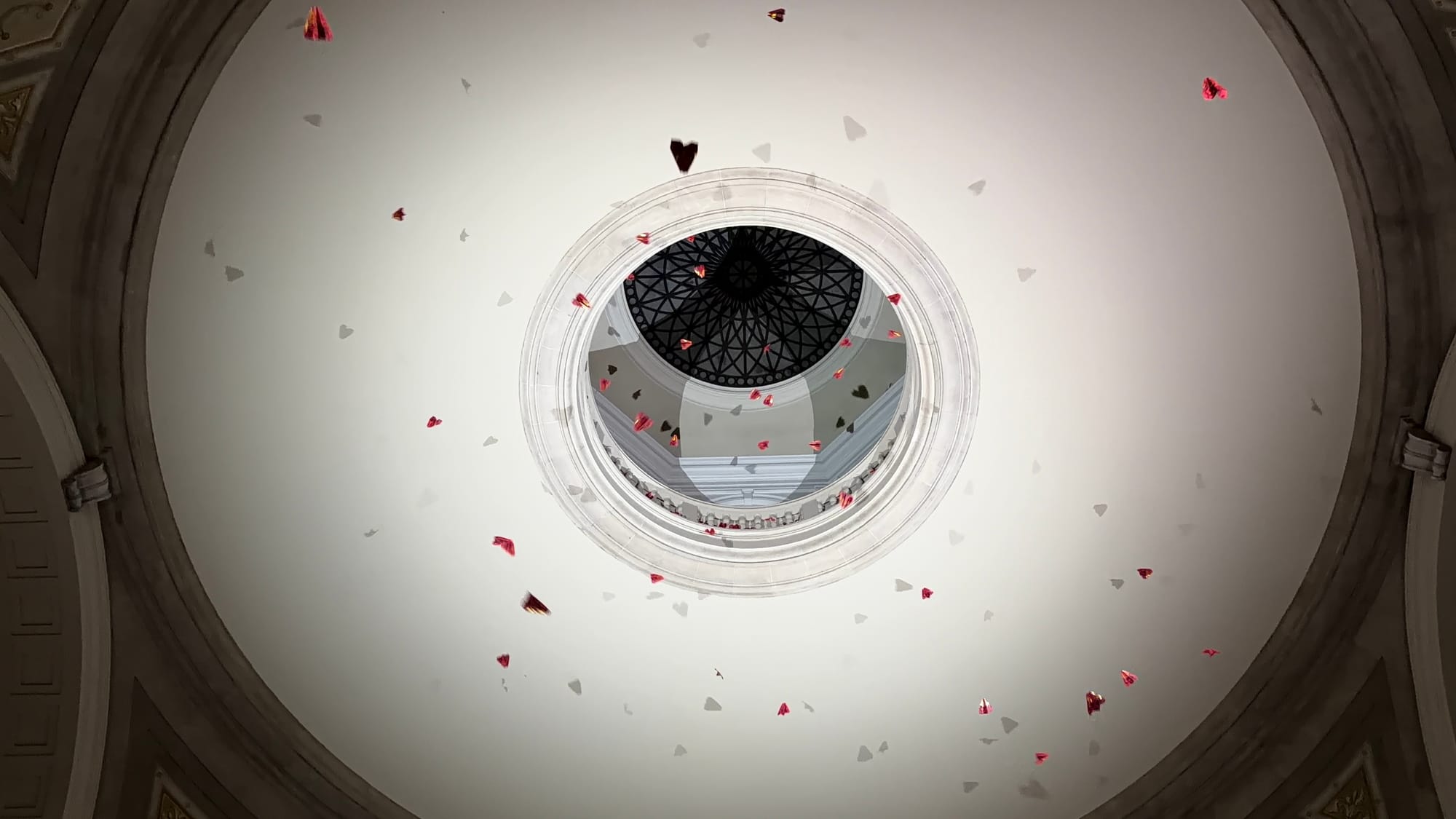 The performance consists of a seemingly infinite number of paper planes, whirling and diving as their trajectories explore the boundaries of a seven-floor atrium gallery. Imaginary contrails trace downwards from above, as the planes flutter down from the gallery's oculus, pausing briefly in front of the four one-word murals (Safety, Success, Thrift, and Wisdom), finally coming to a rest at ground level. The airborne choreography is set to Thousand Ripples, a soundscape by composer and pianist Yeonjoon Yoon. Performed on two Steinway pianos as a duet with himself, Yoon combines the live performance and autonomous playback with continuous replay and delay, resulting in an ever-evolving composition.