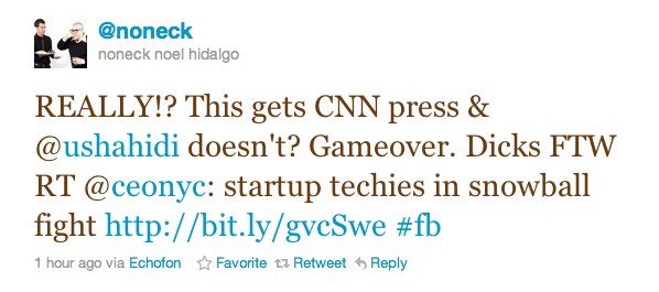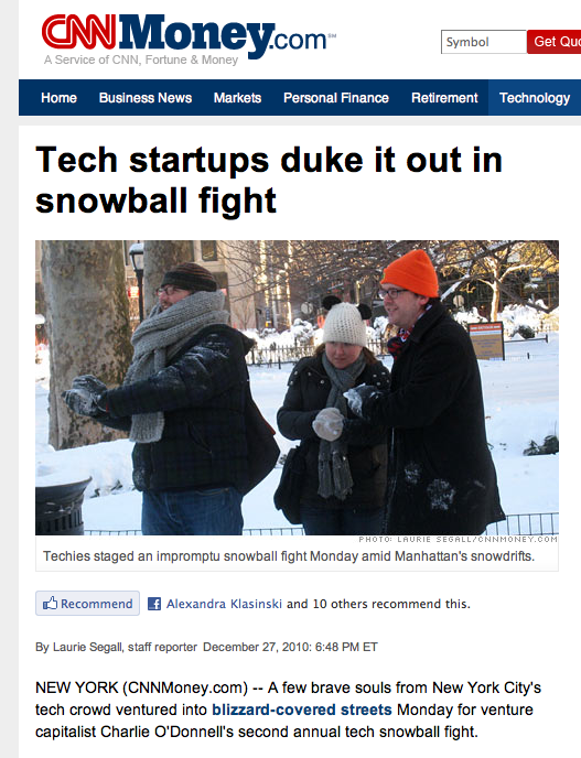Today, there was word going around that there was going to be some sort of geek snowball fight. At first glance, I was a little put off – one VC emailing a tech mailing list does not a snowball fight make. I was strong armed by (close friend) Alexandra Klasinski to show up, and so we trudged out of our warm apartment into the very snowy world.