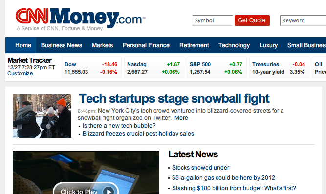 A snowball fight, the CNN Money homepage, and me.